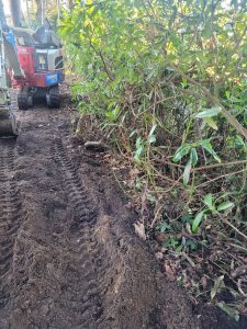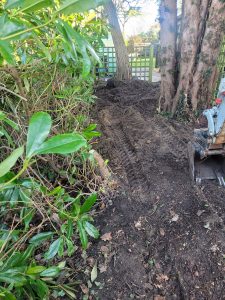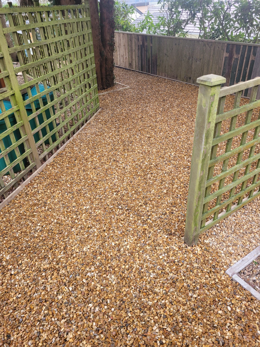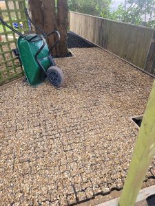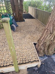An unused area in the garden was turned into a store area for garden use, the sloping ground was levelled up by installing a lower sleeper retaining wall below the new fence line, the area was trimmed out and gravel grids over a membrane were used as a firm but permeable base topped off with 14mm shingle