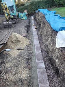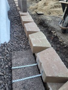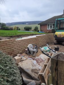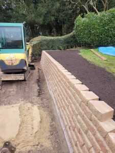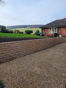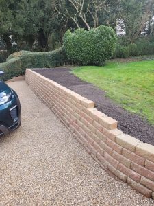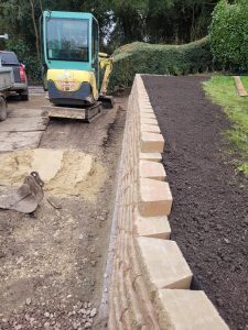 Two jobs in 1! An awkward bank to maintain was corrected by digging out and back to install a Marshalls Croft Dry stone retaining block, this also created extra parking space to the driveway.