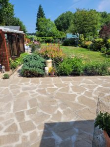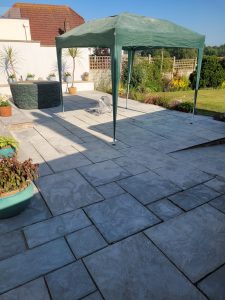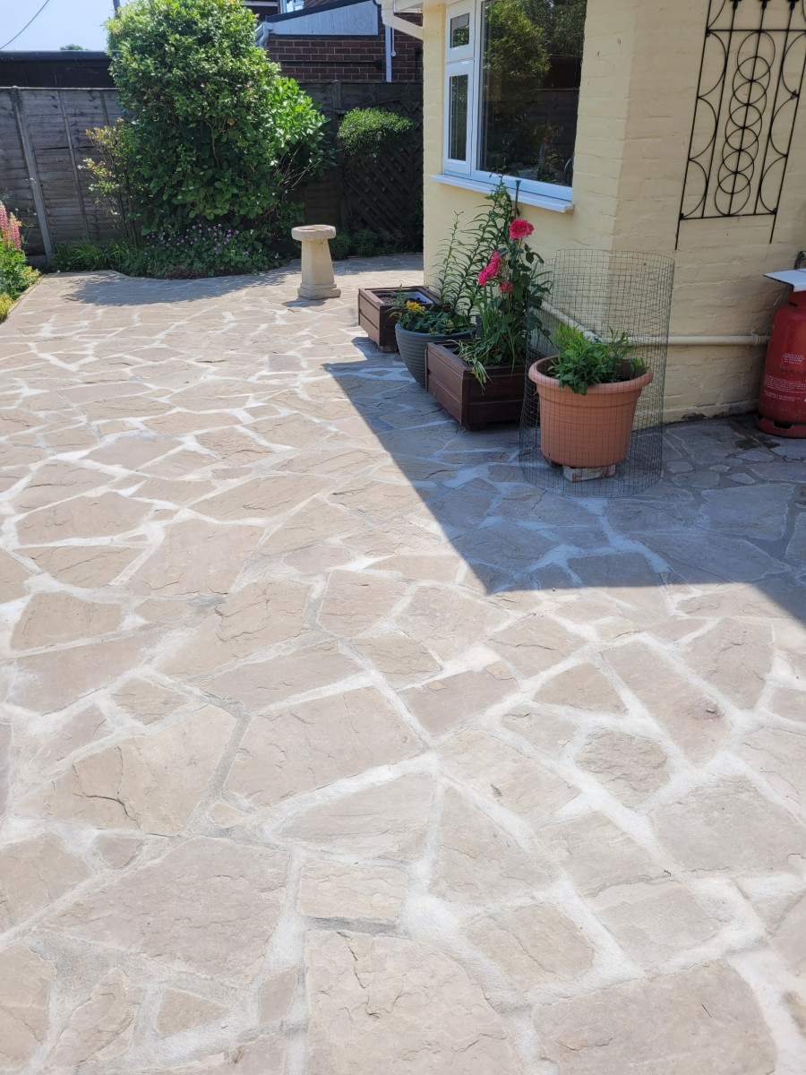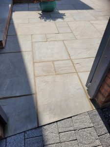 Old mixed Concrete slabs removed and new indian sandstone mixed size slabs installed with a new sub-base
